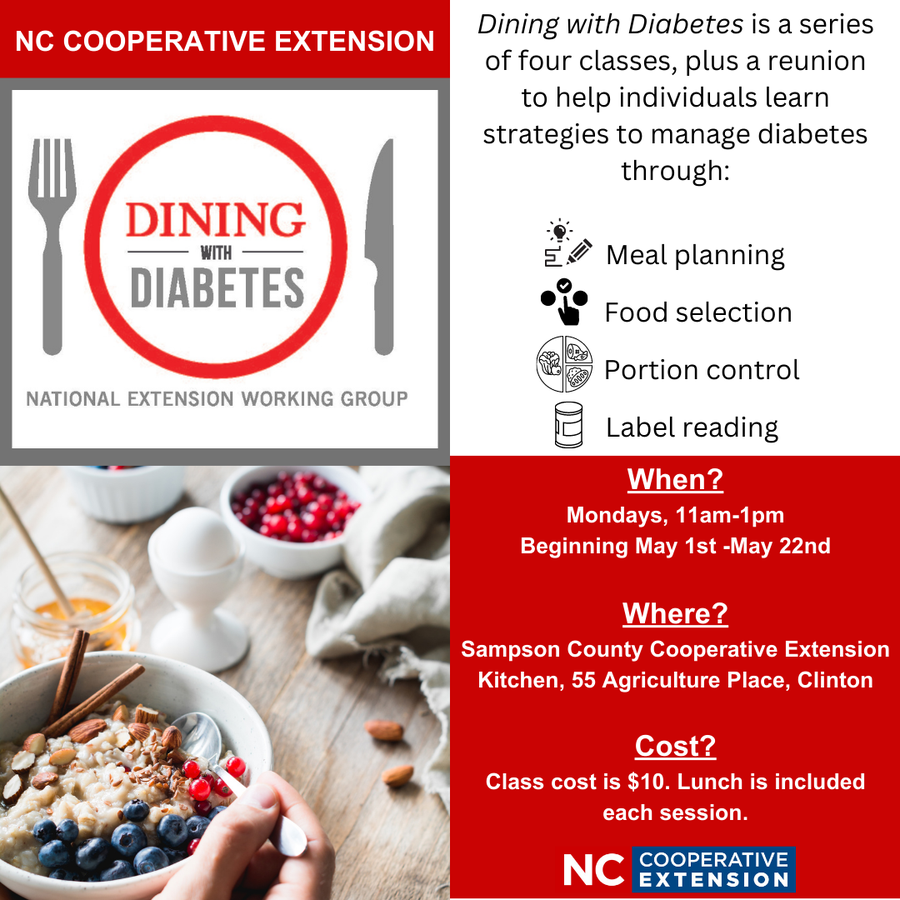 Dining with Diabetes is a series of four classes, plus a reunion conducted by Cooperative Extension. This hands-on-workshop will teach strategies to manage diabetes while cooking a healthy lunch.